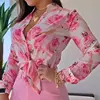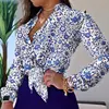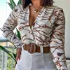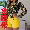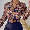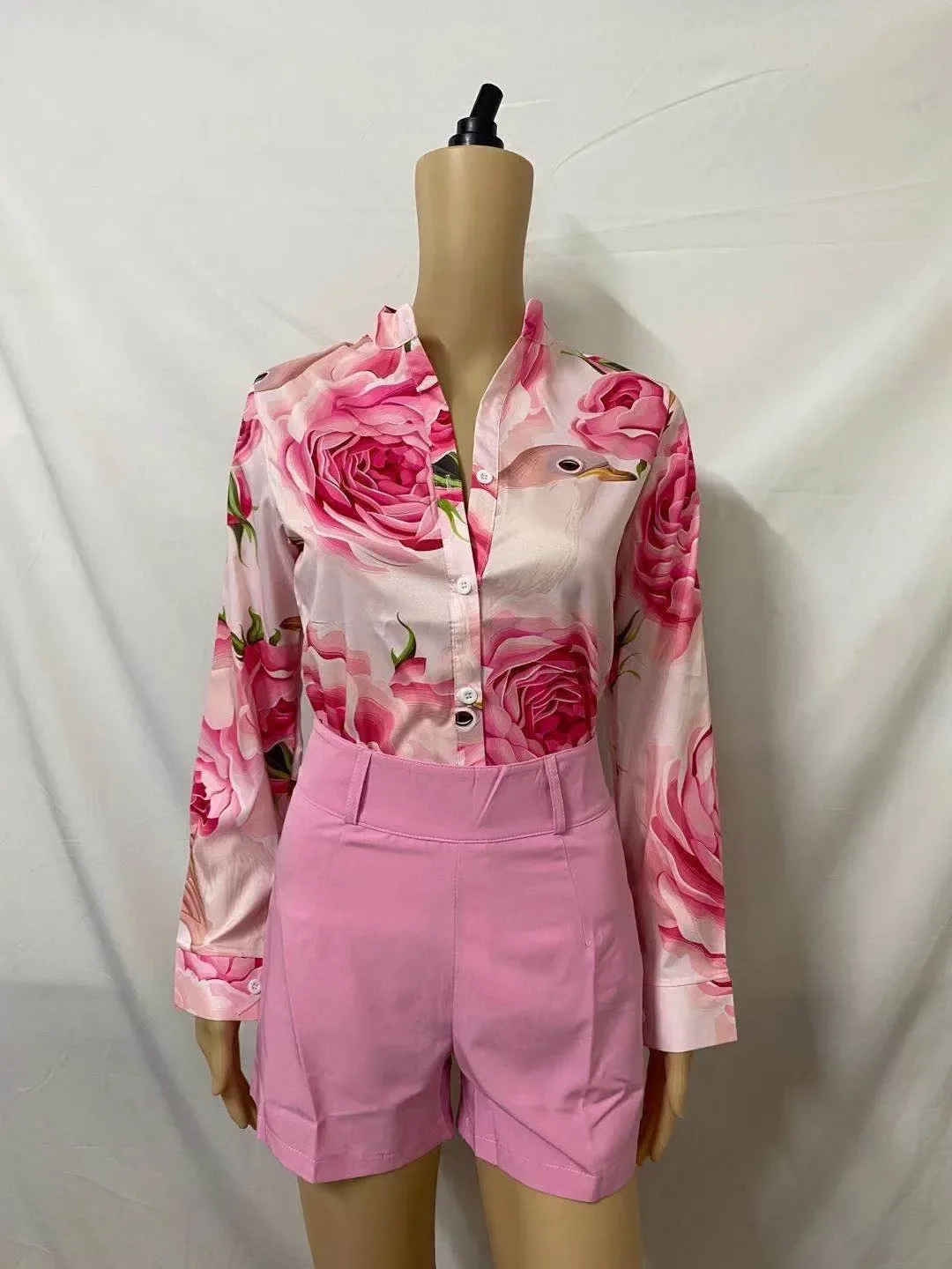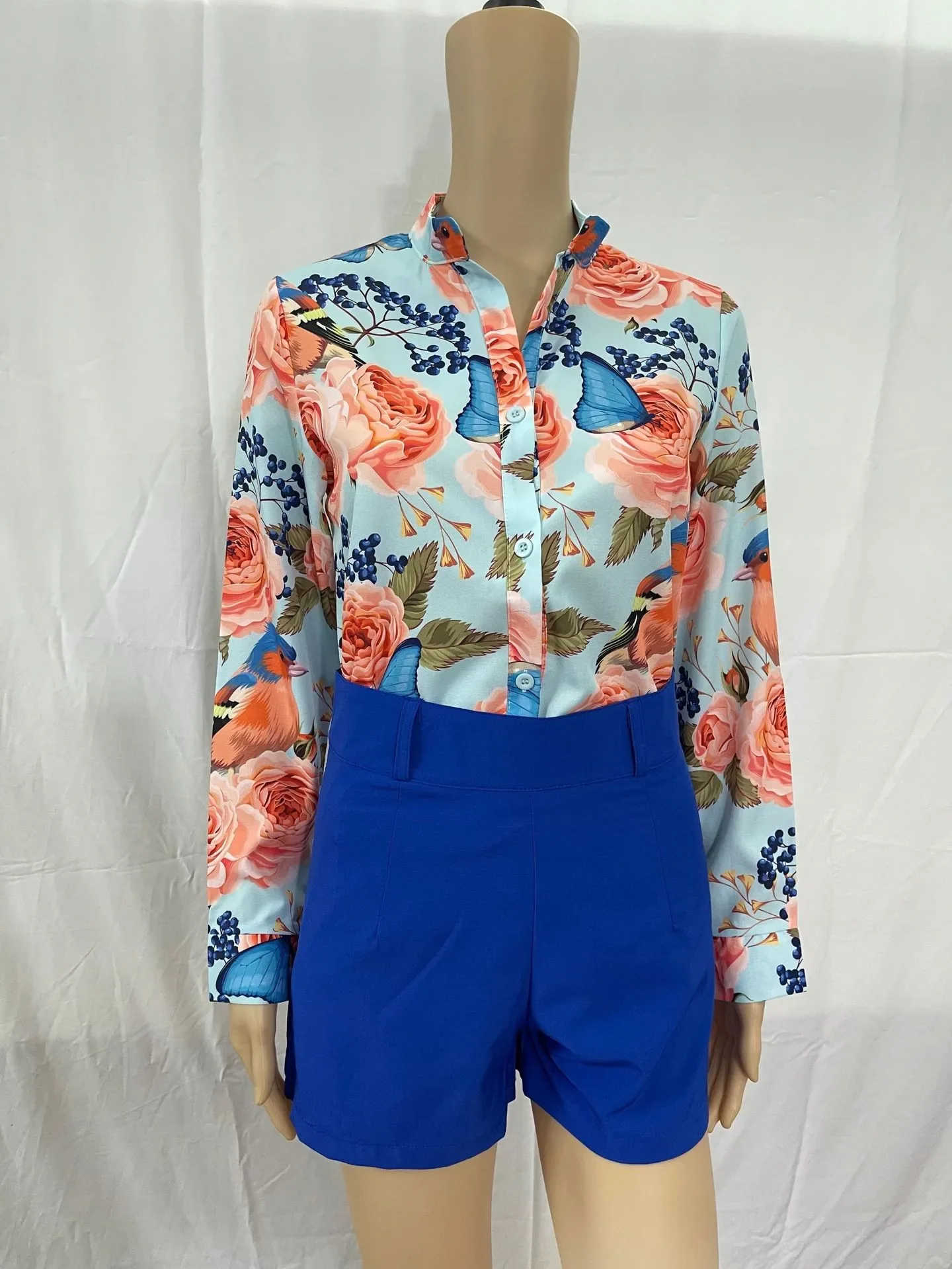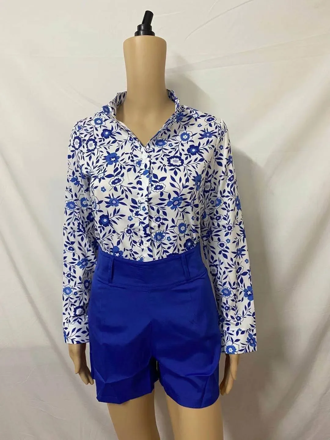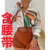 Women’s Spring New Fashion Light Mature Digital Printed Stand Collar Long Sleeve Shirt+solid Color Zipper Shorts and Brown Belt