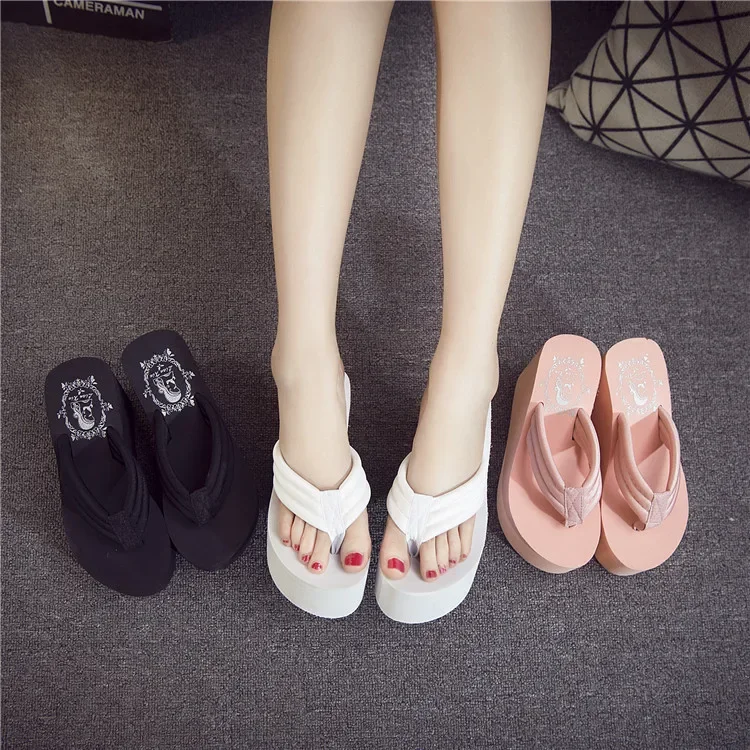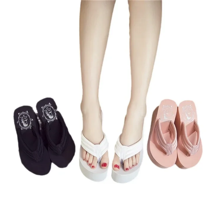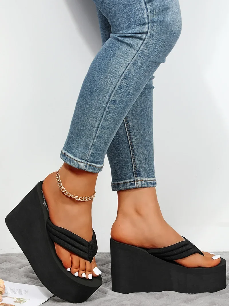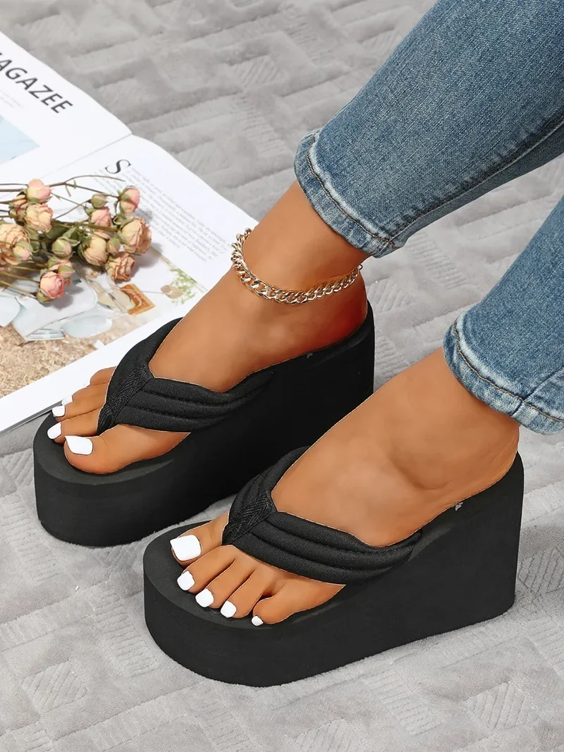Women’s Summer High Heel Platform Sandals Thick Bottom Slip-On Beach Shoes Comfortable Cushioning Fashionable Flat Sandals